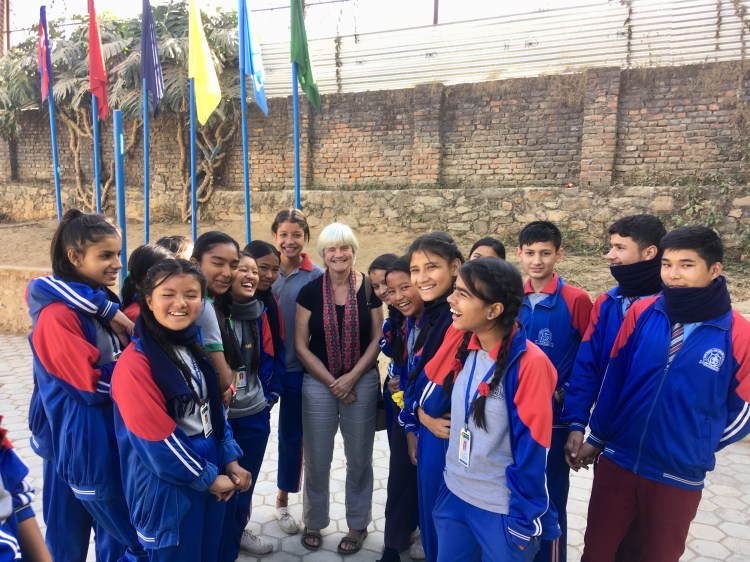 The £3,300 raised for us by Blanchelande College has been divided equally between the new primary school we are building in NE Cambodia, the Lake Clinic and Bani Bilas Secondary School in Kathmandu, Nepal. Bani Bilas was almost totally destroyed by the earthquake in 2015 and was rebuilt with help from Guernsey. Our donation will provide some much needed IT equipment and additional resources for their library. This photo shows Claudine with a group of senior students during a visit to the school in 2019.